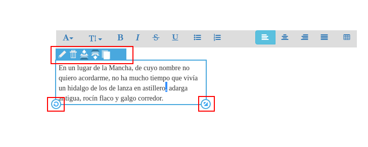 • Componente Texto: Se trata de una caja que permite introducir el texto deseado. Al hacer doble clic sobre el mismo se mostrará una barra de herramientas que permite dar formato al texto introducido. Además se puede ver que aparece un fragmento del texto seleccionado indicando que se puede modificar el contenido de la caja de texto