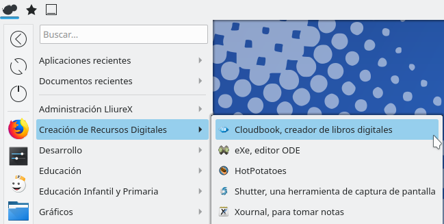 Para ejecutar la aplicación desde LliureX hay que acceder al Menú>Creación de Recursos Digitales>Cloudbook.