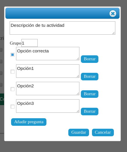 Para editarla se hará clic sobre la misma para seleccionarla y presionar el botón de edición ( Lápiz ) . Una vez en modo edición, se podrá escribir la pregunta o descripción del test, cada una de las respuestas, indicar cuales de ellas son las respuestas correctas (marcando el correspondiente checkbox) y añadir o quitar respuestas. Se la da opción de que ninguna de ellas sea valida, por lo que no habría que poner una opción de todas las anteriores son validas.
