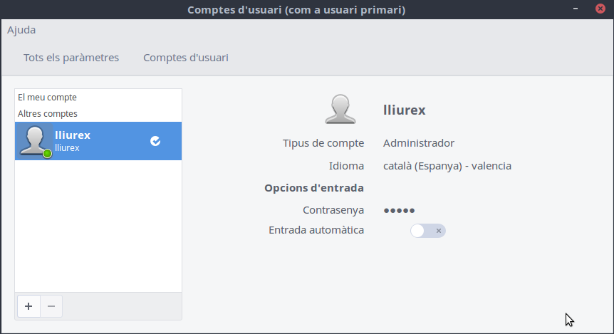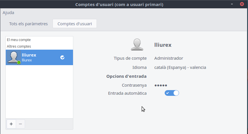 Si durant la instal·lació d'un equip mitjançant una ISO es manté l'opció "Entrada automàtica" en l'inici de sessió; una vegada s'haja instal·lat l'equip, ja no és possible desactivar aquesta opció a través de l'aplicació "Usuaris i grups" que es mostra al menú.