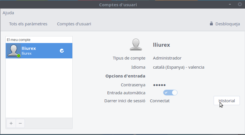Si s'utilitza aquesta opció, per a poder canviar l'opció Entrada automàtica, primer hem de fer clic a Desbloqueja i una vegada introduïda la contrasenya es podrà modificar l'opció.