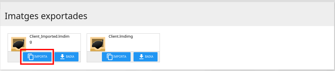 Una vegada tenim la imatge exportada podem guardar-la com a còpia de seguretat o importar-la en un altre servidor. Per a importar-la copiarem l'arxiu de la imatge en /var/www/exported (serà necessari disposar de permisos de superusuari).