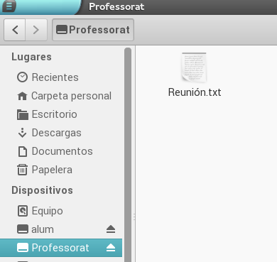 La carpeta Professorat es accesible desde la Carpeta personal del profesorado del sistema, tanto para lectura como para escritura. En ella, podemos copiar o crear ficheros y directorios nuevos, y compartirlos sin que el alumnado pueda acceder al contenido. Para su acceso, también existe un acceso directo en el escritorio.