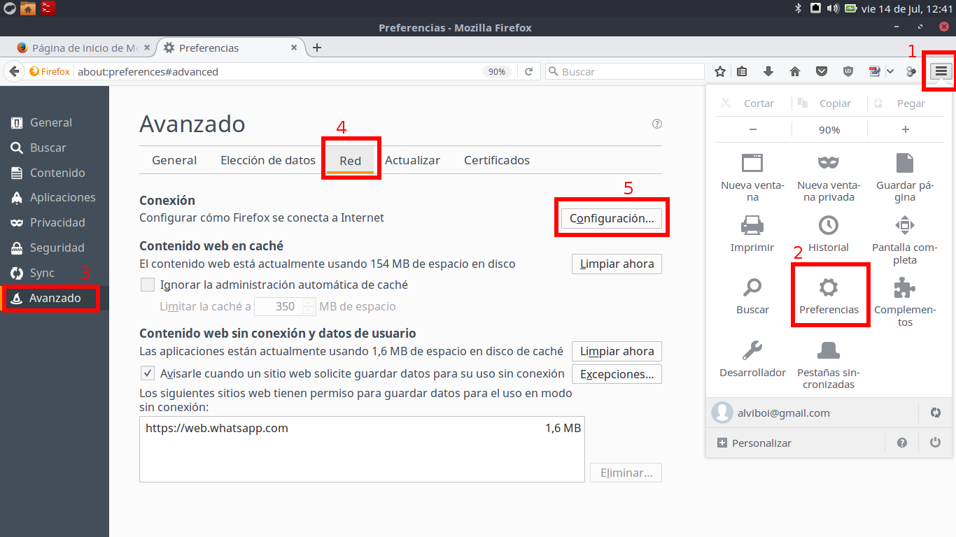 Para configurar firefox, podemos hacerlo de la siguiente manera. Vamos a Inicio > Preferencias > Avanzado > Red > Configuración.