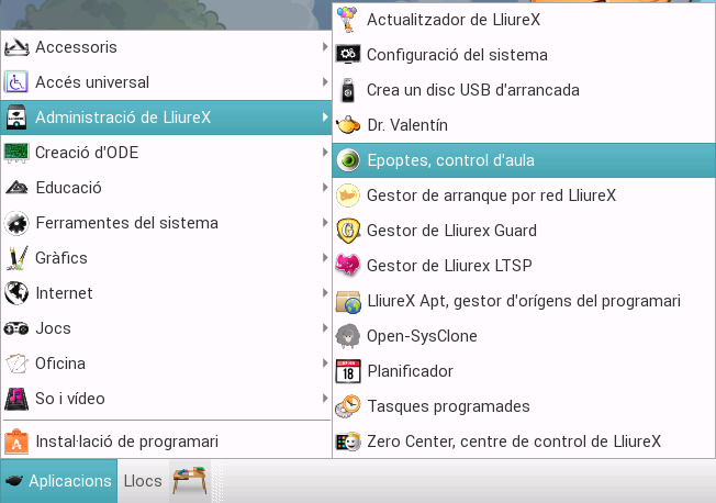 Podem accedir a l'aplicació a través del menú Aplicacions -> Administració de LliureX -> Epoptes, control d'aula.