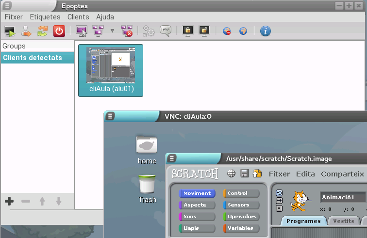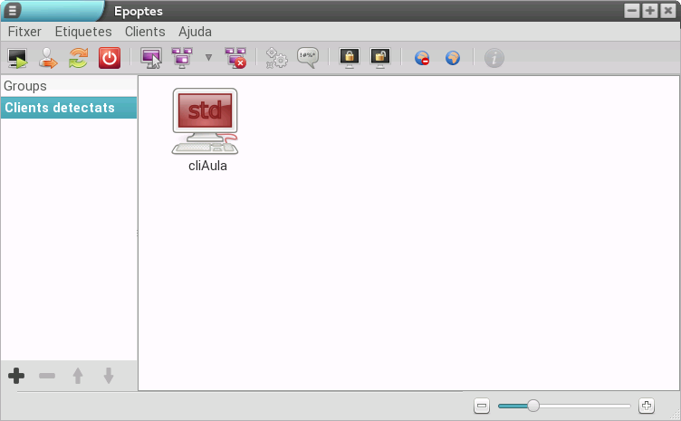 IMPORTANT: És important recordar que el procés pel qual el servidor de l'Epoptes es comunica amb els clients requereix que estiga encés abans que els clients de l'aula vagen arrancant. Si un client d'aula s'inicia abans que el servidor de l'aula haja arrancat del tot, pot ser que l'aplicació no ho detecte (i que també fallen altres serveis de l'aula). Només caldrà reiniciar aqueix equip perquè tot torne a funcionar correctament.