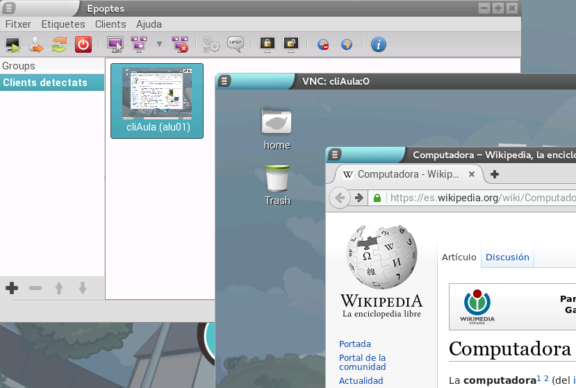 Si un client encara no ha iniciat sessió (com és el cas de la captura anterior), és a dir, l'alumne no ha introduït el seu usuari i la contrasenya, l'Epoptes no pot mostrar l'escriptori d'aqueix usuari i el que es veu és un ordinador xicotet que mostra, en la pantalla, el tipus de client (lleuger o pesat) que arrancarà quan l'alumne s'identifique. En cas contrari, es mostra l'escriptori de l'alumne en miniatura, així com l'usuari amb què s'ha iniciat sessió (en el missatge que es mostra davall de la captura).