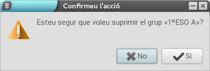 També podem eliminar grups en el cas que fera falta mitjançant el botó -.Per a eliminar un grup hem de seleccionar-lo i polsar aquest botó. Aleshores es mostrarà una pantalla de confirmació en què haurem de seleccionar Sí.