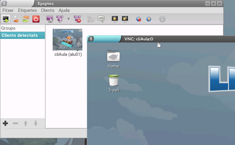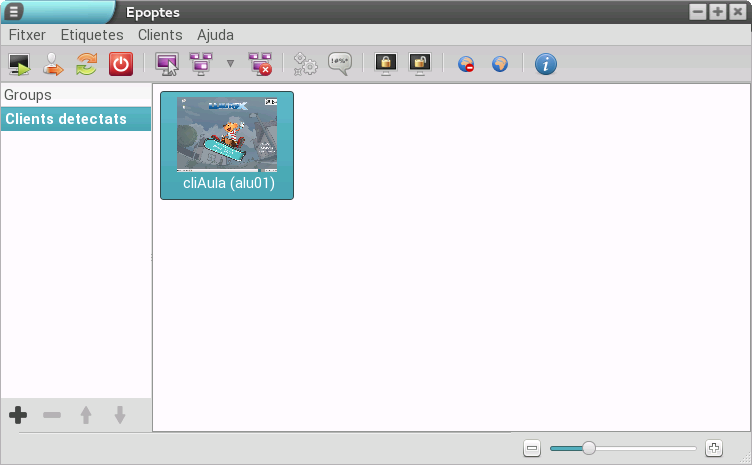Si un client encara no ha iniciat sessió (com és el cas de la captura anterior), és a dir, l'alumne no ha introduït el seu usuari i la contrasenya, l'Epoptes no pot mostrar l'escriptori d'aqueix usuari i el que es veu és un ordinador xicotet que mostra, en la pantalla, el tipus de client (lleuger o pesat) que arrancarà quan l'alumne s'identifique. En cas contrari, es mostra l'escriptori de l'alumne en miniatura, així com l'usuari amb què s'ha iniciat sessió (en el missatge que es mostra davall de la captura).
