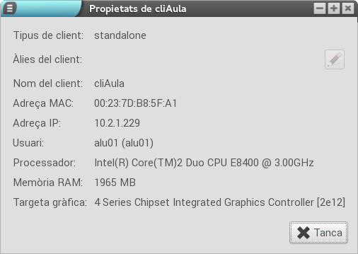 L'últim botó del menú mostra detalls del client connectat a l'Epoptes. Entre altres informacions es mostra la següent: