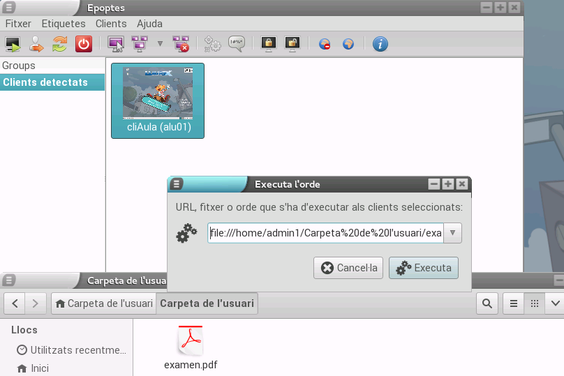 Quan polsem sobre l'opció d'executar es mostra una finestra en què podem introduir una pàgina web perquè s'òbriga, un fitxer per a transferir-lo als PC de l'alumnat o una ordre per a executar-la als clients.