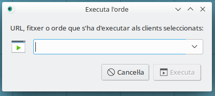 Quan polsem sobre l'opció d'executar es mostra una finestra en què podem introduir una pàgina web perquè s'òbriga, un fitxer per a transferir-lo als PC de l'alumnat o una ordre per a executar-la als clients.