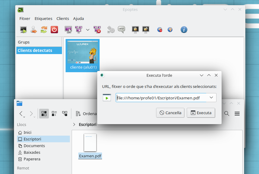 • Fitxer: si en compte d'apegar un URL d'Internet, el que fem és introduir el camí fins a un document o fitxer del nostre equip, l'Epoptes envia aqueix fitxer als clients i l'obri. Una manera molt senzilla d'utilitzar aquesta eina és arrossegar i soltar un document en PDF (per exemple un examen) sobre el quadre de text d'Executa l'ordre, tal com es mostra en la imatge. Una vegada polsem el botó Executa, el fitxer s'obri en tots els clients.