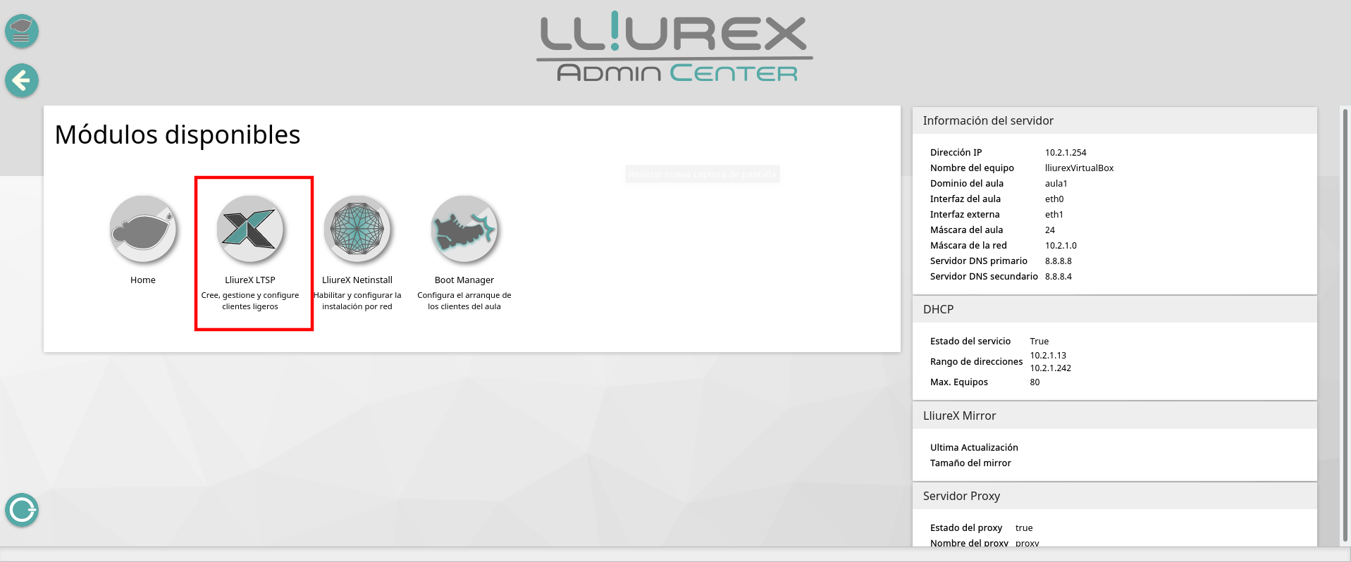En LliureX 19 la creación de imágenes para clientes ligeros utiliza un sistema de gestión llamado admincenter al que podemos acceder directamente desde localhost. Una vez nos hayamos identificado, vamos al apartado t del LliureX LTSP .