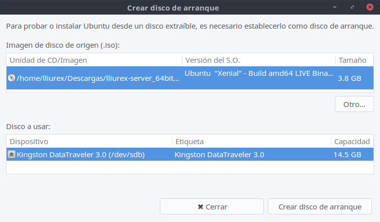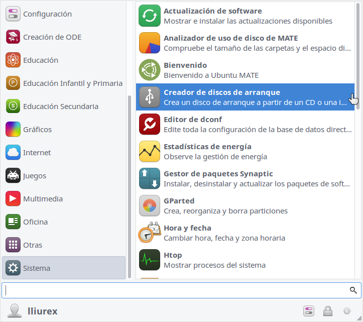 Para crear un usb de arranque LliureX 16 lleva ya un programa que nos permite crearnos un usb de arranque rápida y fácilmente, para ello vamos a Inicio > Sistema > Creador de discos de arranque e iniciamos el programa: