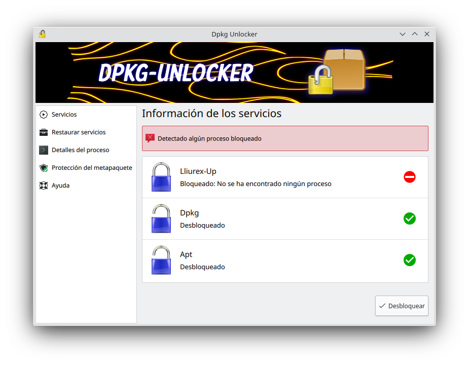 Para facilitar ambas gestiones se ha desarrollado la aplicación Dpkg-Unlocker. Cuenta con un modo gráfico (dpkg-unlocker-gui) y una versión para terminal (dpkg-unlocker-cli). A continuación se describe su funcionamiento.