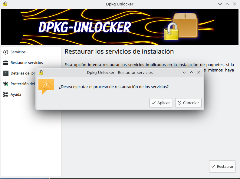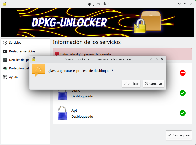 16 Dpkg Unlocker ES  Al hacer clic en Aplicar se mostrará un cuadro de dialogo para confirmar la acción.