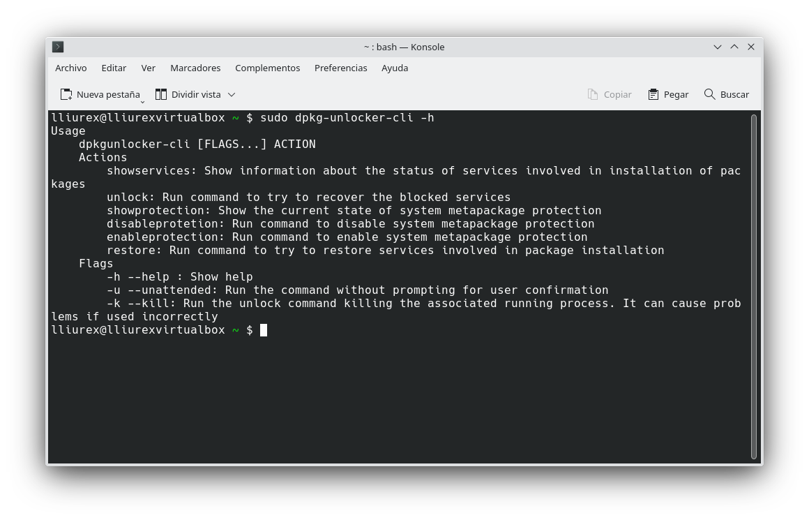 Para ejecutar la versión para terminal de dpkg-unlocker hay que abrir una terminal y escribir:  sudo dpkg-unlocker-cli -h.  Se mostrará una ayuda con los modos de funcionamiento de la herramienta.