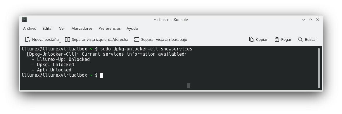 Mediante el comando sudo dpkg-unlocker-cli showservices se muestra el estado de Lliurex-Up,Dpkg y Apt: