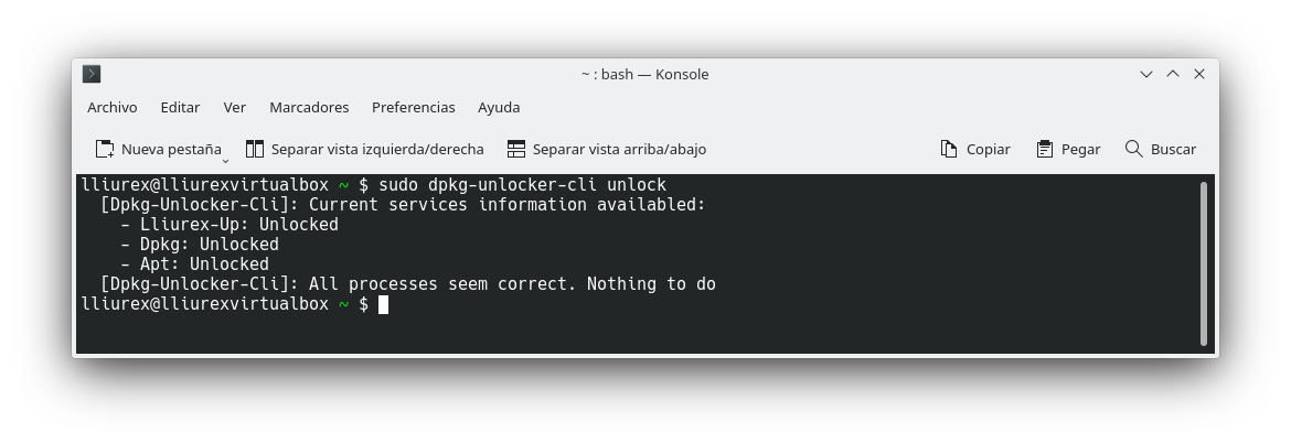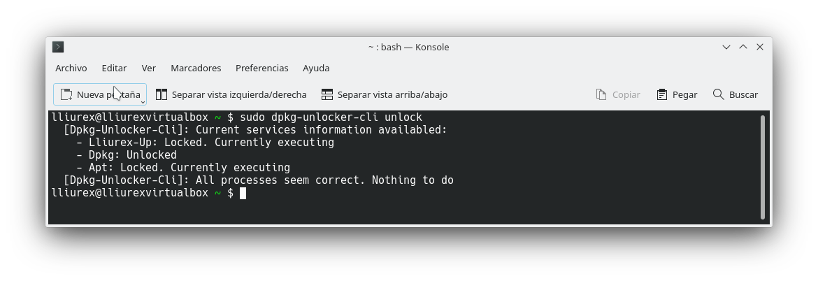 09 Dpkg Unlocker ES Mediante el comando sudo dpkg-unlocker-cli unlock se muestra el estado de Lliurex-Up,Dpkg y Apt. Algunos ejemplos