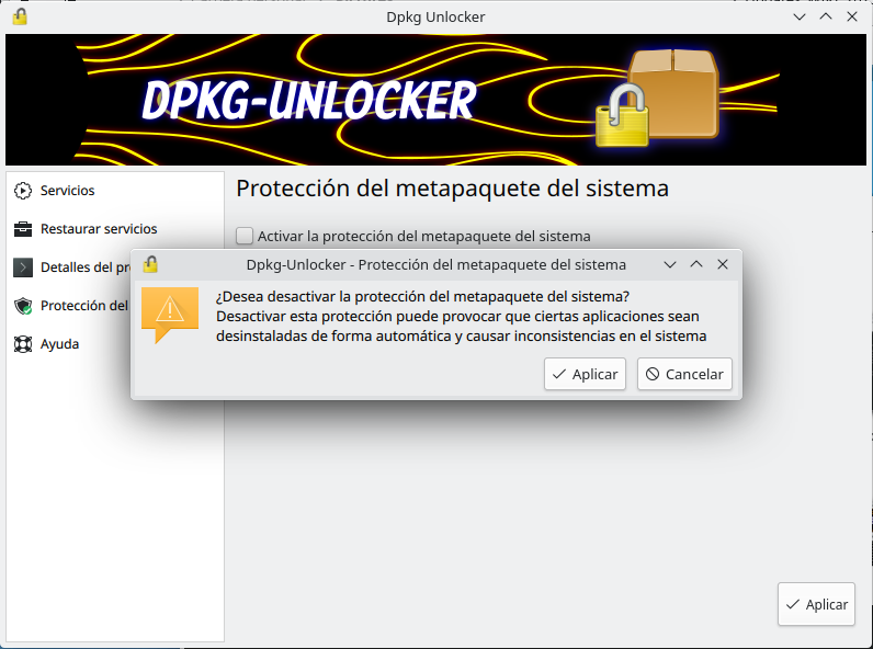 20 Dpkg Unlocker ES A continuación, si se confirma la acción, la protección será desactivada.
