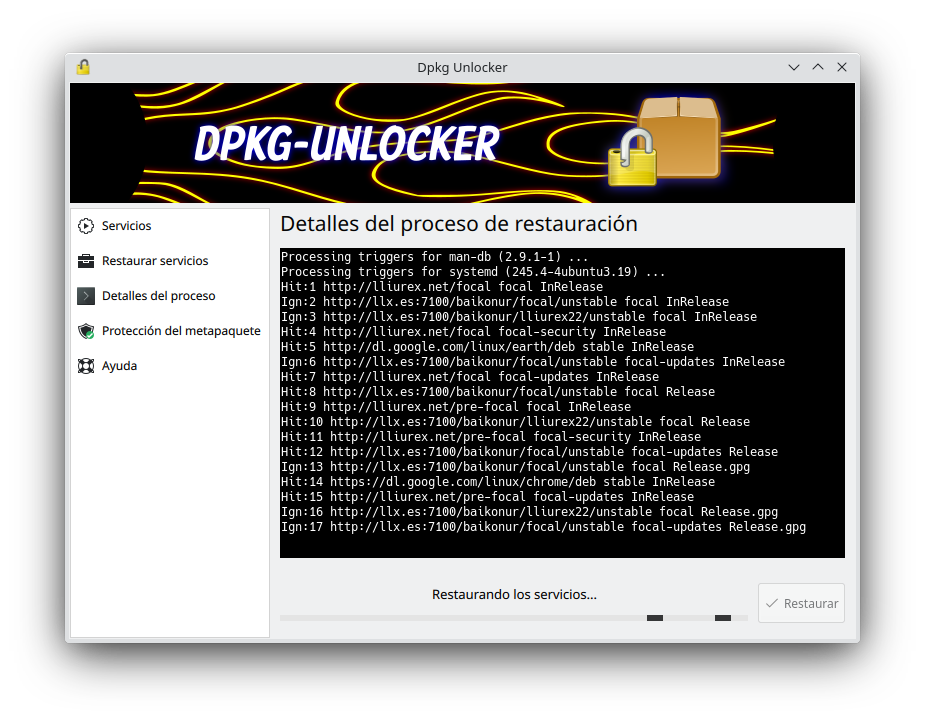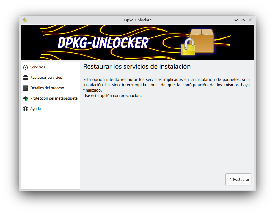Para ejecutar el proceso de restauración de servicios mediante dpkg-unlocker-cli se usará el comando: dpkg-unlocker-cli restore