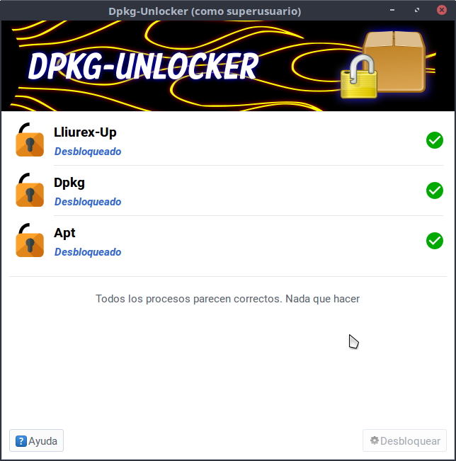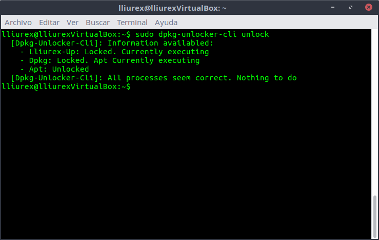 Si se ejecuta sudodpkg-unlocker-cli unlock -u o (--unattended) la rutina de desbloqueo se lanzará (si la situación detectada lo permite) sin pedir confirmación al usuario.