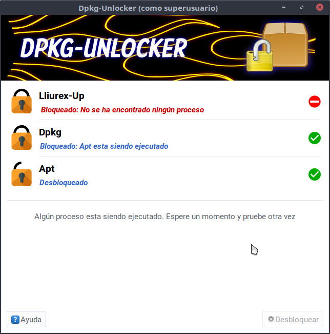 En el caso de que sedetecte que Lliurex-Up, Apt, o Dpkg estan bloqueados pero no hay ningún proceso asociado en marcha, dpkg-unlocker considera que la situación es anómala y habilita la posibilidad de ejecutar el proceso de desbloqueo.