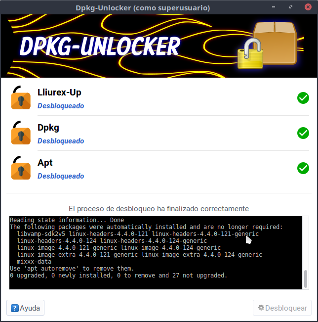 Al finalizar se muestra el estado en que han quedado Lliurex-Up, Apt y Dpkg, indicando además si el proceso de desbloqueoha finalizado con éxito o si por el contrario se han producido errores en el mismo.