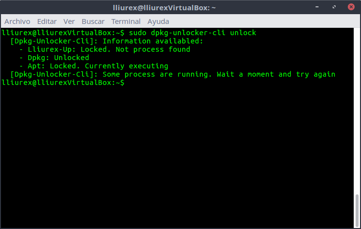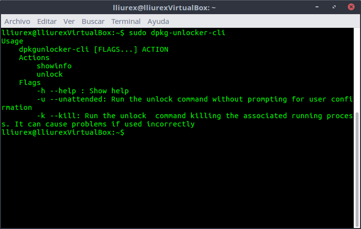 Para ejecutar la versión para terminal de dpkg-unlocker hay que abrir una terminal y escribir: sudo dpkg-unlocker-cli. Se mostrará una ayuda con los modos de funcionamiento de la herramienta.