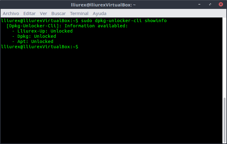 Mediante el comando sudo dpkg-unlocker-cli showinfo se muestra el estado de Lliurex-Up,Dpkg y Apt: