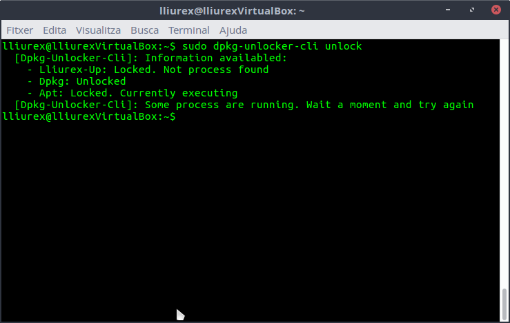 Mediante el comando sudo dpkg-unlocker-cli unlock se muestra el estado de Lliurex-Up,Dpkg y Apt. Algunos ejemplos