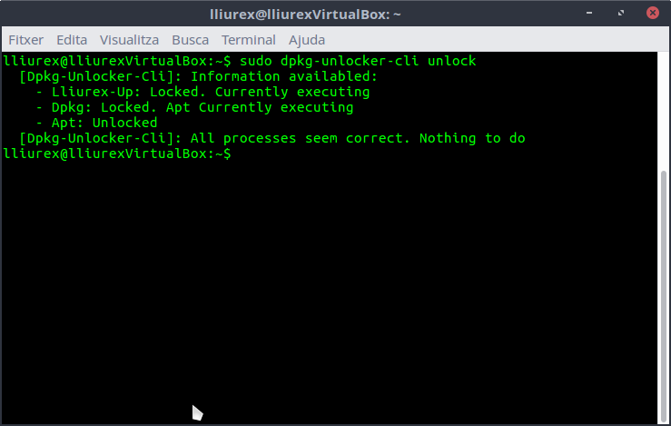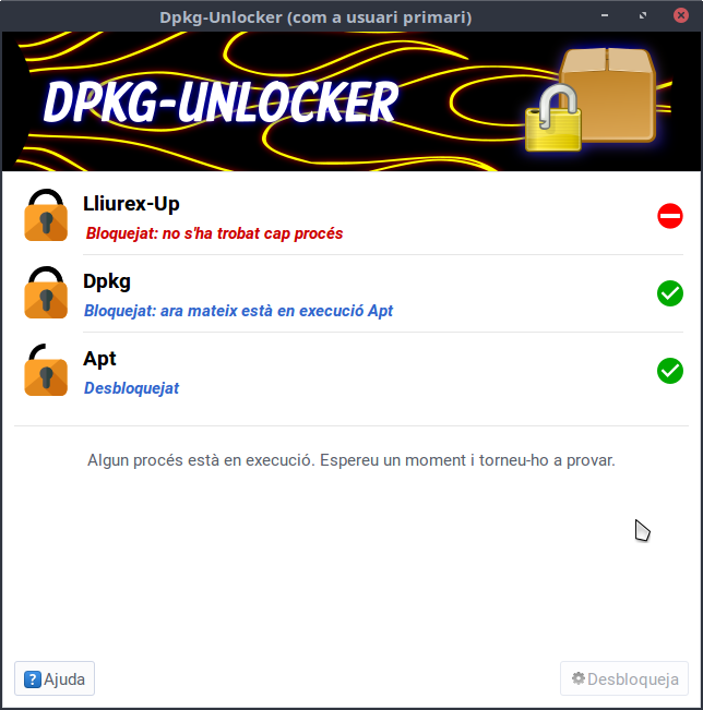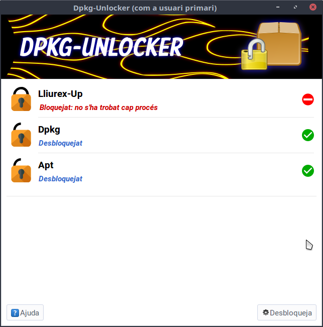 Amb l'ordre sudo dpkg-unlocker-cli unlock es mostra l'estat del Lliurex-Up, Dpkg i Apt. Alguns exemples: