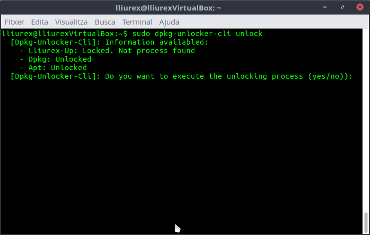 Si s'executa sudodpkg-unlocker-cli unlock -u o (--unattended), la rutina de desbloqueig s'executarà (si la situació detectada ho permet) sense demanar confirmació a l'usuari.