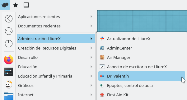 Para ejecutar el Dr. Valentín con interfaz gráfica tenemos que acceder a través del menú: Aplicaciones -> Administración LliureX -> Dr Valentín.