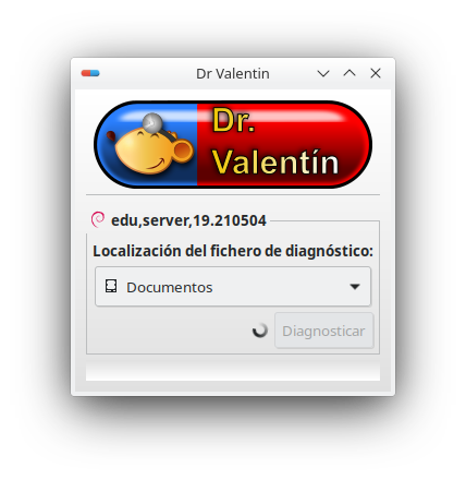Una vez seleccionado, se muestra una ventana con el logo del Dr. Valentín y donde podemos seleccionar, utilizando el menú desplegable, la carpeta destino (por defecto ofrece el escritorio del usuario que está ejecutando el programa) en donde el programa guardará el fichero comprimido (de extensión .tar.gz). Una vez seleccionada, sólo queda presionar el botón Diagnosticar.