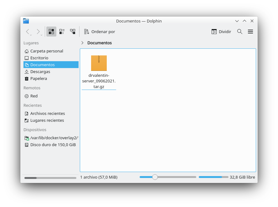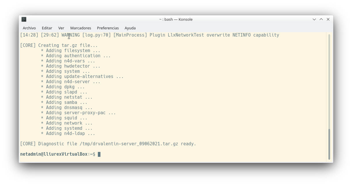 En este modo, cuando se termina la ejecución, se muestra un texto que marca dónde está el fichero de diagnóstico (en el ejemplo está en /tmp/drvalentin-server_09062021.tar.gz.