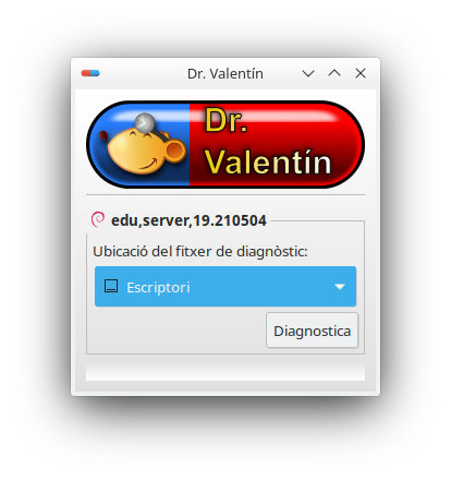 Una vegada seleccionat, es mostra una finestra amb el logotip del Dr. Valentín i podem seleccionar, utilitzant el menú desplegable, la carpeta de destinació (per defecte ofereix l'escriptori de l'usuari que executa el programa) en la qual el programa guardarà el fitxer comprimit d'extensió .tar.gz. Una vegada seleccionada, només queda prémer el botó Diagnostica.