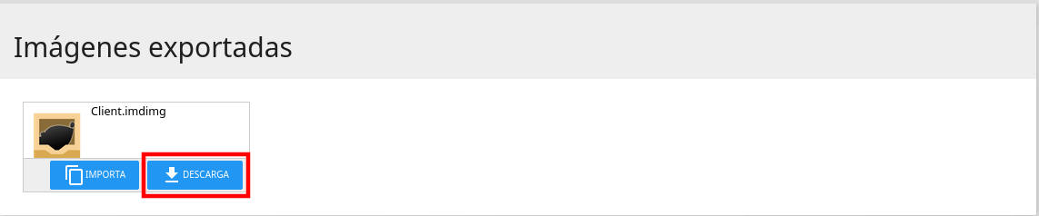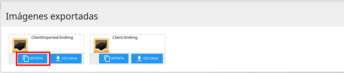 Una vez tengamos la imagen exportada podemos guardarla como backup o importarla en otro servidor.  Para importarla copiaremos el archivo de la imagen en /var/www/exported (será necesiario disponer de permisos de superusuario).