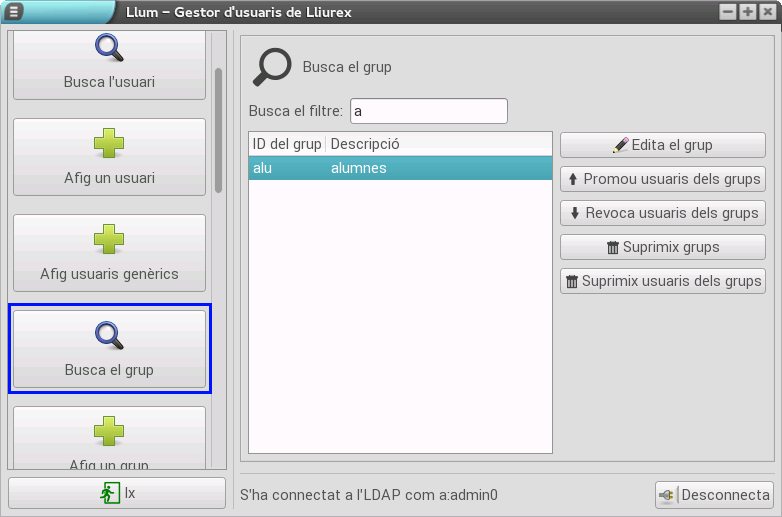 En cas de seleccionar algun dels grups del llistat filtrat, s'habilitaran tots els botons amb opcions de la dreta: Edita el grup, Promou usuaris del grups, Revoca usuaris dels grups, Suprimix grups i Suprimix usuaris del grups.