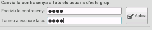 • Contrasenya: podem canviar la contrasenya a tots els usuaris al mateix temps, per al que hem d'introduir la clau per duplicat i polsar el botó Aplica.