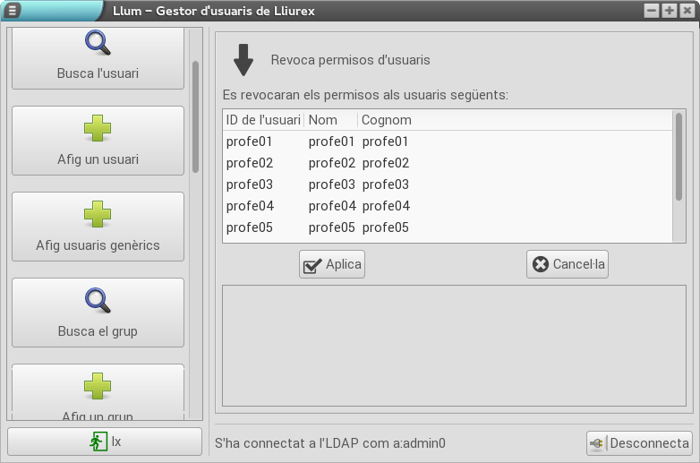 Per a realitzar l'acció contrària a l'anterior, és a dir, eliminar els permisos atorgats als usuaris d'un determinat grup hem de polsar el botó Revoca usuaris dels grups. Una vegada polsat, es mostra un llistat tots els usuaris del grup, els quals seran degradats.