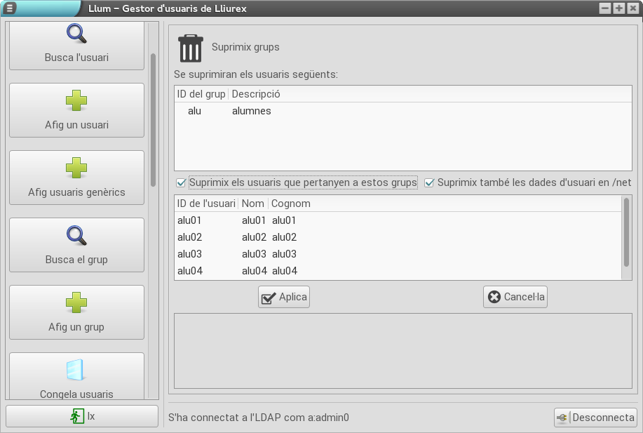 Si volem eliminar un grup, polsemel botó Suprimix grups i es mostra, tant el nom i descripció del grup, com els usuaris que pertanyen a eixe grup. En el cas que vullguem esborrar els usuaris, junt amb el grup, podem seleccionar l'opció Esborrar els usuaris.