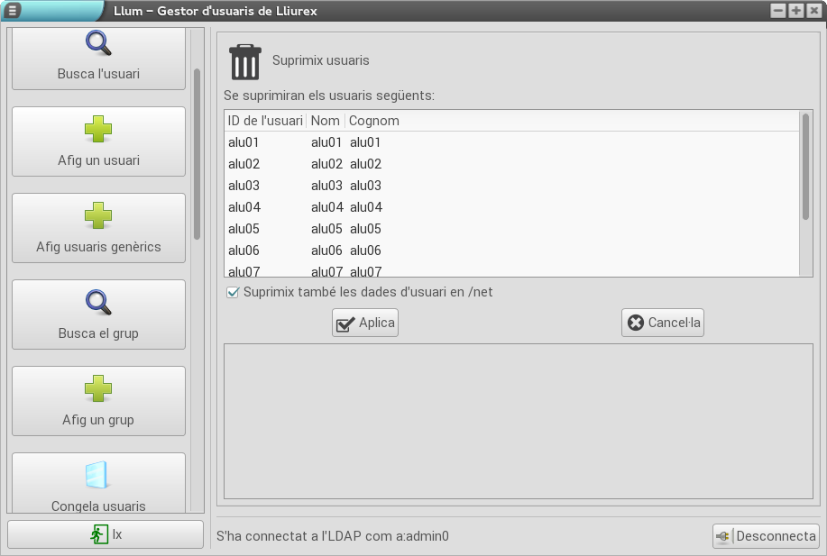 Una altra operació que podem realitzar és la d'esborrar usuaris que pertanyen a un grup, per al que polsem el botó Suprimix usuaris dels grups.  Després de polsar-ho,es mostra una llista amb tots els usuaris del grup i una opció per a eliminar les seues dades de la carpeta /net (per defecte està seleccionat).