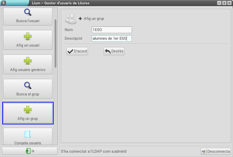 Per a accedir, hem de polsar el botó Afig un grup. A continuació introduïm el nom i la descripció, i polsem el botó Accepta per a finalitzar la creació.