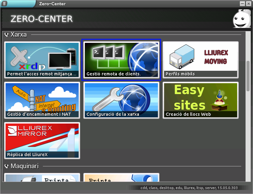L'accés a l'aplicació es realitza mitjançant el Centre de control de LliureX, a través del menú Aplicacions -> Administració de LliureX -> Zero Center, centre de control de LliureX.
