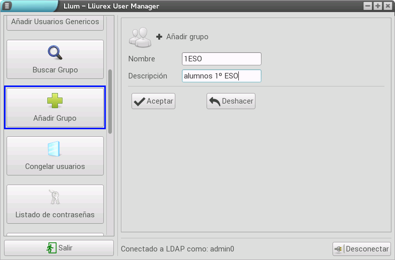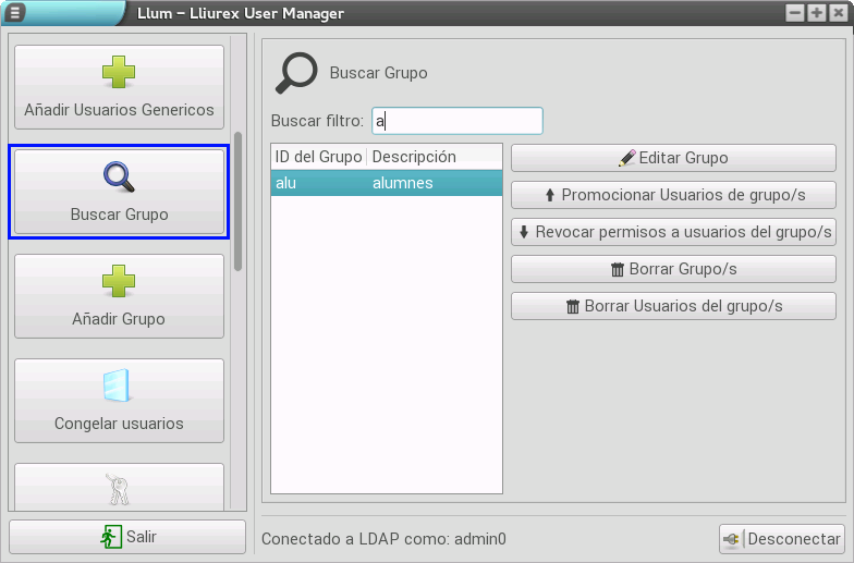 Además de la gestión de los usuarios, el LLUM permite una serie de operaciones sobre grupos. Concretamente, podemos: