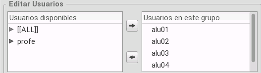 • Usuarios: la edición de los usuarios se realiza pasando de la columna izquierda (usuarios no incluidos en el grupo) a la de la derecha (usuarios incluidos en el grupo) y viceversa.