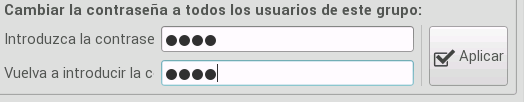 • Contraseña: podemos cambiar la contraseña a todos los usuarios a la vez, para lo que debemos introducir la clave por duplicado y pulsar el botón Aplicar.