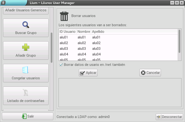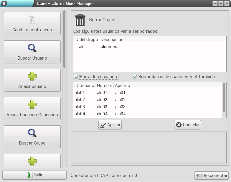 Otra operación que podemos realizar es la de borrar usuarios que pertenecen a un grupo, para lo que pulsamos el botón Borrar Usuarios del grupo/s.  Tras pulsarlo, se muestra una lista con todos los usuarios del grupo y una opción para eliminar sus datos de la carpeta /net (por defecto está seleccionado).